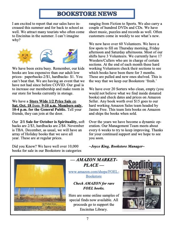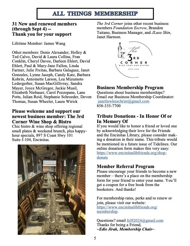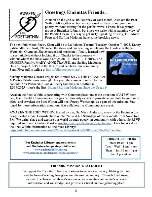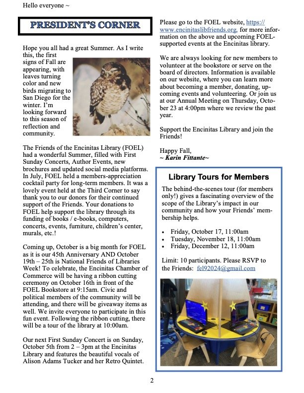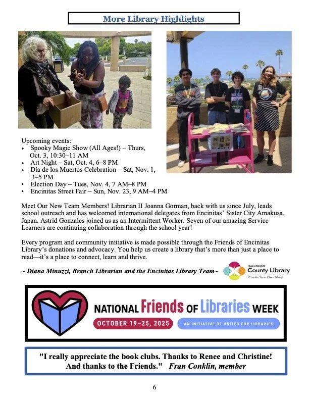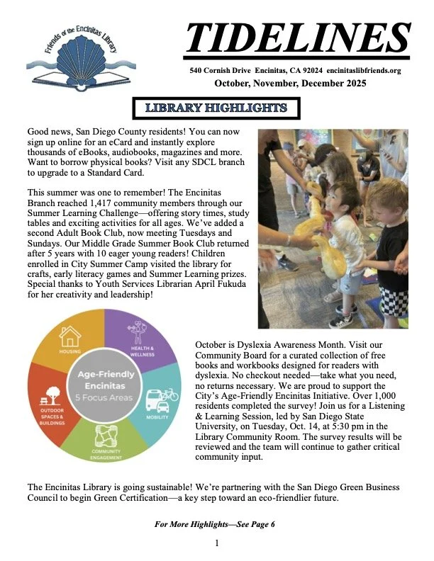 A non-profit organization designed Our o support the Encinitas Library as it strives to encourage literacy, lifelong learning and